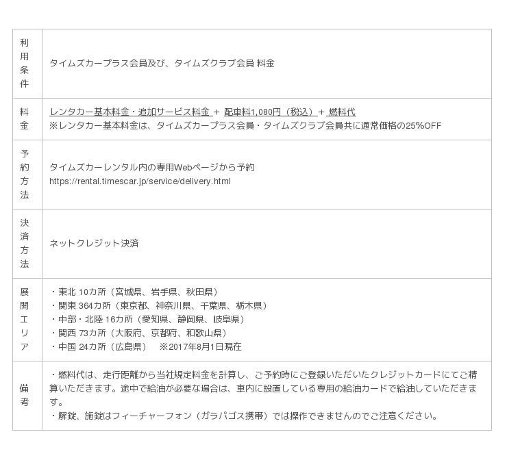 タイムズモビリティネットワークス株式会社(本社:広島県広島市、社長:川崎計介)は、2017年8月8日(火)より、福岡県においてレンタカーをご希望のピッとGoステーションまで届けて貸し出す「ピッとGoデリバリー」の提供を開始します。九州における本サービスの提供は当社初となります。