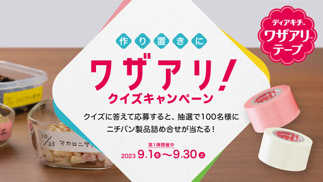 ニチバン株式会社(本社:東京都文京区、社長:高津敏明)は、キッチン周りでラベルや封止めに便利な「ディアキチ(TM)ワザアリ(TM)テープ」に関するクイズに答えて応募すると、ニチバン製品が抽選で100名様に当たる「作り置きにワザアリ!クイズキャンペーン」を2023年9月1日(金)より開始いたします。