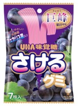 「さけるグミ」はもちっと新食感でさいて食べたり、そのまま食べたりいろいろな食べ方が楽しめるグミです。現在のラインナップはからだにやさしい乳酸菌「フェカリス菌」入りで巨峰果汁を使用した濃厚な巨峰味。友達や家族でシェアできるピロー7枚入りです。フレーバーはそのままにインパクトのある40cmのなが~いグミ。開け口にマジックカットを採用し、簡単に開けることができます。