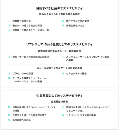 当社は、誰もが心地よく健康に、そして幸せに働ける社会を目指し、労働にまつわる社会課題に真摯に向き合い、一つひとつの課題解決を推し進めてまいりました。こうした取り組みを加速させるために、この度、中長期視点での経営戦略として、当社及びステークホルダーにとって重要度の高い対応すべき課題を総合的に評価し、特に優先して取り組むべきテーマとして15項目のマテリアリティを特定しました。特定したマテリアリティは「目指すべき社会のサステナビリティ」「ソフトウェア・SaaS企業としてのサステナビリティ」「企業基盤としてのサステナビリティ」の3つに区分し、今後それぞれの分野における目標達成に向けてより具体的なマイルストーンを定め、継続的に事業活動に取り組んでまいります。