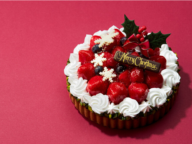 クリスマスリースを表現したかわいらしいタルトケーキ。ピスタチオ風味のカスタードとアーモンドタルトに苺・ラズベリー・ブルーベリーを敷き詰め仕上げました。