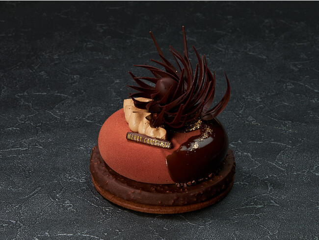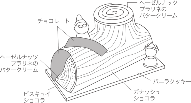 濃厚なヘーゼルナッツプラリネのバタークリームをしっとりとしたビスキュイショコラで包んだケーキ。ガナッシュショコラで丸太の表面を表している、チョコレート好きの方におすすめの一品。