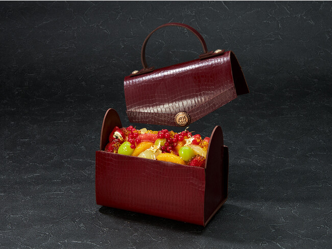 チョコレートで精巧に作られたバッグを開けると、中からキラキラと宝石のように輝くさまざまなフルーツが。マスカルポーネのムース、ラズベリージュレやビスキュイカカオなどを10層重ねることで、食べすすめていくごとに違う食感をお楽しみいただけます。限定10台の、サプライズにおすすめのケーキです。