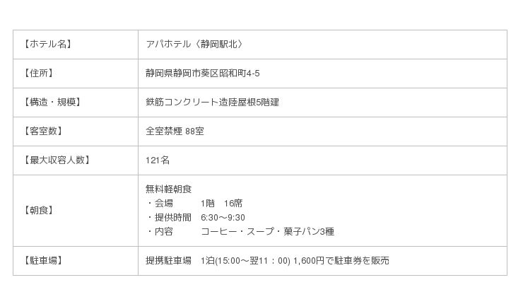 アパホテル〈静岡駅北〉は静岡市内アパホテル初進出のホテルとなる。静岡県内では、アパホテル〈浜松駅南〉(177室・浜松市)、アパホテル〈富士中央〉(163室・富士市)を含め3棟428室(直営・FC)を展開している。