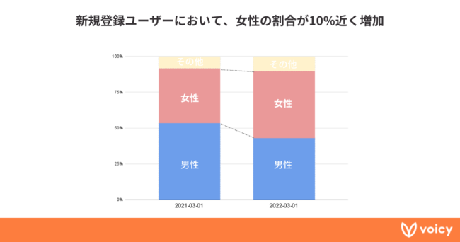 ※2 Voicyリスナーアカウントに新規登録された性別の割合について、2021年3月と2022年3月を比較した数値
