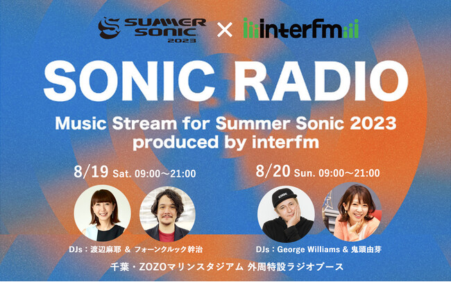 インターFM(東京:89.7MHz)は、SUMMER SONIC 2023の会場用特別企画として、2020年9月までインターFMで放送していた「SONIC RADIO」を限定復活させると共に、出演するアーティストゲストが決まりましたことをお知らせ致します。