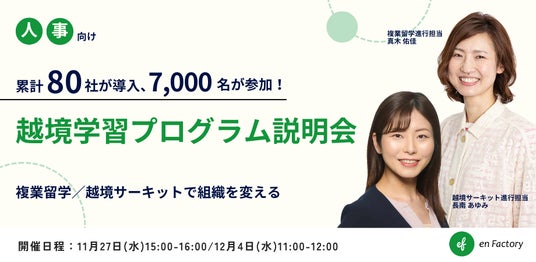 株式会社エンファクトリー(東京都千代田区、代表取締役社長CEO加藤健太、以下、弊社)は、2024年11月27日(水)15:00~と2024年12月4日(水)11:00~に、『人事向け越境学習プログラム説明会~累計80社が導入、7,000名以上が参加!複業留学/越境サーキットで組織を変える~』を開催いたします。(イベントページ:https://form.k3r.jp/enfactory/ekkyo-program?k3ad=enfactory)