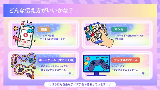 このため神奈川県では、条例・計画の趣旨をわかりやすく、かつ印象的に伝えるための新たな発信方法を検討しています。動画、マンガ、ゲームなど、子どもや若者が関心を持ちやすいメディア表現の活用も視野に入れています。発信方法を検討していくにあたり、より効果的に情報を届ける方法のアイデアを広く募集し、今後の施策に生かす方針です。