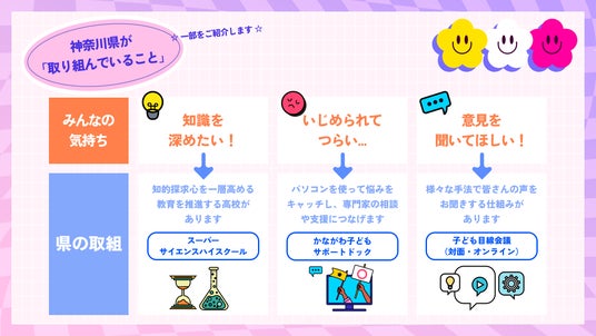 神奈川県では、子どもや若者をはじめ、誰もが「自分らしく幸せに」暮らせる社会の実現を目指し、2025年4月1日に「神奈川県こども目線の施策推進条例」及び「かながわ子ども・若者みらい計画」を施行しました。これらには、子どもや若者が社会の一員として意見を表明する機会を確保するとともに、その意見を施策に適切に反映させることなどが盛り込まれています。