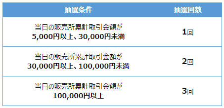 キャンペーン期間中、当日の販売所累計取引金額に応じて抽選に参加できます(獲得した抽選回数は当日のみ抽選可能)。