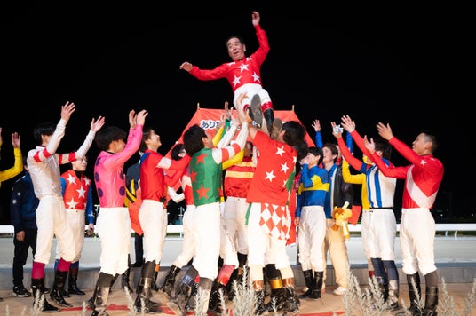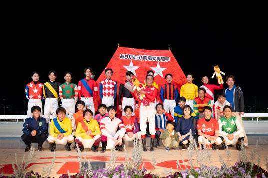 その後プレゼンターを務めていただき、表彰式終了後にはファンのメッセージが書かれた的場騎手の騎手服をモチーフにした特大布をバックに、記念撮影を実施。TCK所属のジョッキーたちも勢ぞろいし、半世紀以上にわたる騎手生活を労いました。