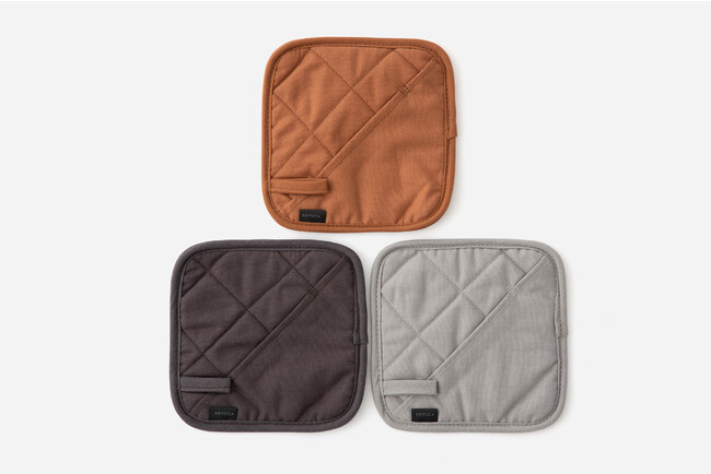 あつあつの料理のお供にぴったりな、耐熱ゴムの滑り止めがついた鍋敷き。片手が入るポケットがついているので、鍋のフタやフライパンの柄をサッとつかむときに便利な、ちょっと使いのミトンとしても使えます。