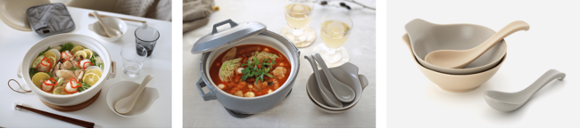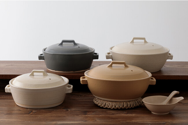 今回、各陶磁器産地の魅力を伝えるべく、三重県四日市市で生産しているモダンな形とやさしい色味が好評の定番アイテム「スタイル 土鍋」と、セットで使える美濃焼 の「スタイル とんすい」「スタイル れんげ」から新色が登場。今年は、土鍋を囲む食器やカトラリーと相性のいい色味のアイテムで食卓をおしゃれにコーディネートしていただけるよう、 定番のホワイトに加えて「スタイル 土鍋」7号サイズではブルーグレー、8号サイズではベージュの新色を開発しました。美濃焼 の「スタイル とんすい」「スタイル れんげ」は、土鍋と同じく定番のホワイトに加えてブルーグレー、ベージュの2色を新たに展開します。