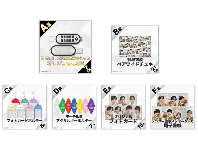 他にもここでしか手に入らない、『フォトカードホルダー』や『モーテル風アクリルキーホルダー』、『オリジナルフォトカード』、未公開ショットを含む『メンバー直筆メッセージ入り電子壁紙』など、いずれかの特典が当たるハズレなしのくじです。