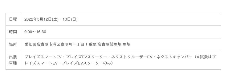 ブレイズでは、電動バイクの試乗体験・ネクストクルーザーEV・ネクストキャンパーの展示を行います。