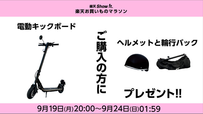 楽天市場「Show !t」は9月19日(月)20時開始、MEISTER.Fの電動キックボードをご購入すると、購入後届いたらすぐにキックボードがある生活を始められる10,000円相当のヘルメットと輪行バックのセットをプレゼントします。電動キックボードで秋の行楽シーズンにアウトドアやレジャを楽しみましょう。また、9月19日(月)20時~9月24日(土)01時59分まで開催される楽天お買い物マラソンに参加し、全商品送料無料でポイント10倍プレゼント(一部商品を除く)を実施します。