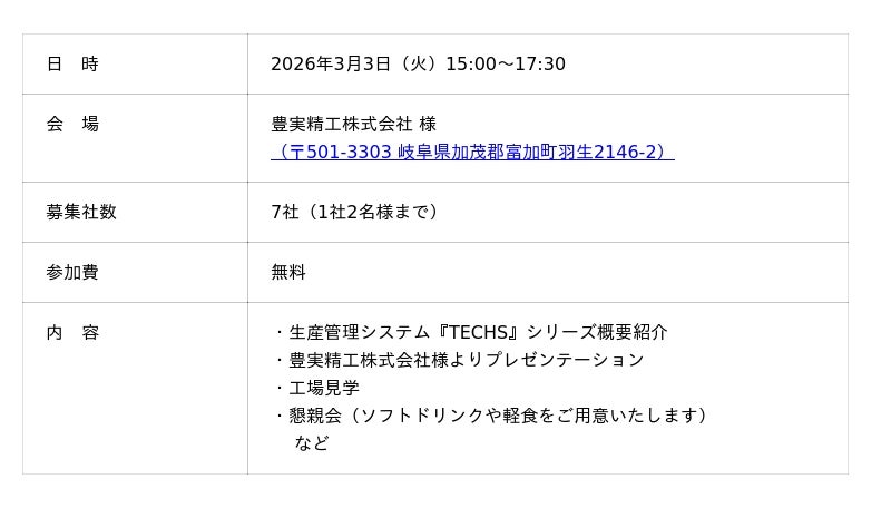 2026年3月3日(火)豊実精工様(岐阜県加茂郡富加町)にて開催|工場見学&活用事例で学ぶ現場運用