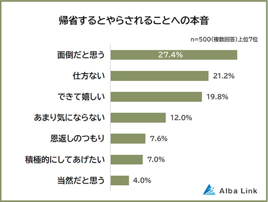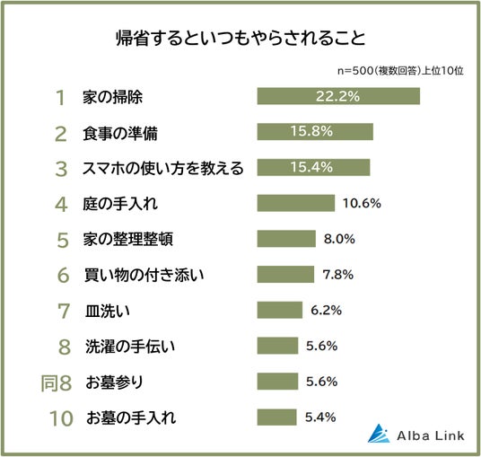 株式会社AlbaLink(本社:東京都江東区、代表取締役:河田 憲二)は、全国の男女500人を対象に「帰省するとやらされることに関する意識調査」を実施し、そのデータをランキングにしました。