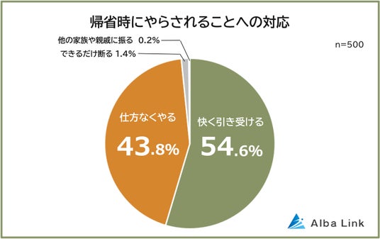 「帰省時にやらされることへの対応」としてもっとも多かったのは「快く引き受ける(54.6%)」で、半数を超えました。一方で「仕方なくやる(43.8%)」も40%以上と、多くなっています。