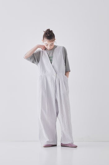 薄手の生地で、サッカー生地の表面感とストライプ柄が特長的なサロペットで、