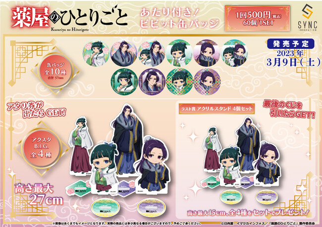 キャラクターグッズの企画・製造・販売を手がけるシンクイノベーション株式会社(代表取締役:三輪直之、本社:愛知県名古屋市)は、TVアニメ『薬屋のひとりごと』の【あたり付き!ビビット缶バッジ】を発売いたします。