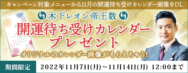 フジテレビ系列で放送中の占い番組『突然ですが占ってもいいですか?』で人気を博している木下レオン。ただいま、月額公式サイト『木下レオン◆帝王数』にて、『11月の開運待ち受けカレンダープレゼントキャンペーン』を開催中です。期間中、対象の占いメニューにサイトオリジナルの開運待ち受けカレンダーがついてくる、お得なキャンペーンとなっております。ぜひこの機会にお試しください。