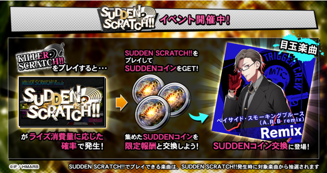 イベント期間中、KILLER SCRATCH!!をプレイするとライズ消費量に応じた確率でSUDDEN SCRATCH!!が発生します。SUDDEN SCRATCH!!をプレイすると、通常の報酬アイテムの他、限定アイテム「SUDDENコイン」を獲得することができます。「SUDDENコイン」を集めることで、新楽曲「ベイサイド・スモーキングブルース(A.R.B remix)」と交換することが可能です。詳細はアプリ内お知らせをご確認ください。