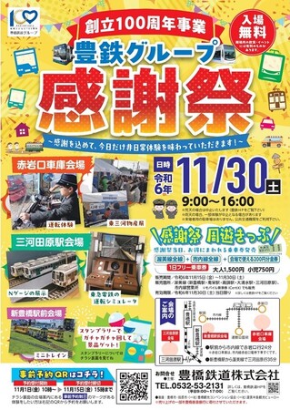 豊橋鉄道株式会社(本社:豊橋市駅前大通 社長:岩ヶ谷光晴)および豊橋鉄道グループは、創立100周年記念のメイン事業として「創立100周年事業 豊鉄グループ感謝祭」を11月30日に開催します。