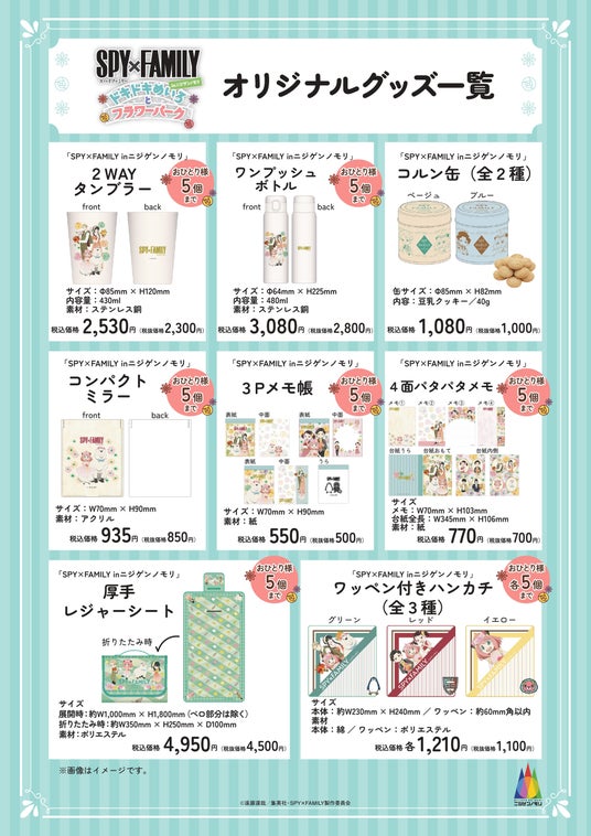TVアニメ『SPY×FAMILY』の期間限定の体験型メイズ「ドキドキめいろ」と、お花をテーマとした装いのキャラクターたちと写真撮影を楽しむことができる「フラワーパーク」の2つのエリアが登場。さらに、限定コラボグッズやキャラクターをモチーフにしたコラボフードも販売する。