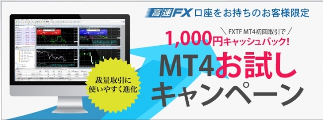 現在、2015年10月31日以前に高速FXをお取引したことがあるお客様限定で、キャンペーン期間中にFXTF MT4を初めてお取引した方に1,000円をキャッシュバックをするキャンペーンを開催しております。