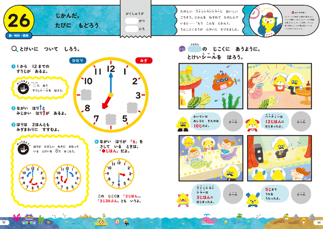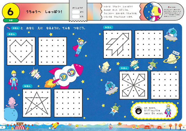 ページごとに作業内容やイラストが異なるので、最後のページまで飽きずにやり遂げることができ、お子さまの次の学習意欲へとつながります。また、シール問題や付録など、お楽しみ要素も盛りだくさんです。