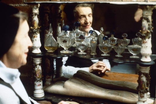 ルイーズ・ブルジョワと《短刀の女》(1969-70)、シャリマーの香水瓶、母の鏡、 1980年 Photo: Mark Setteducati, (C)The Easton Foundation/Licensed by JASPAR, Tokyo and VAGA at Artists Rights Society (ARS), NY