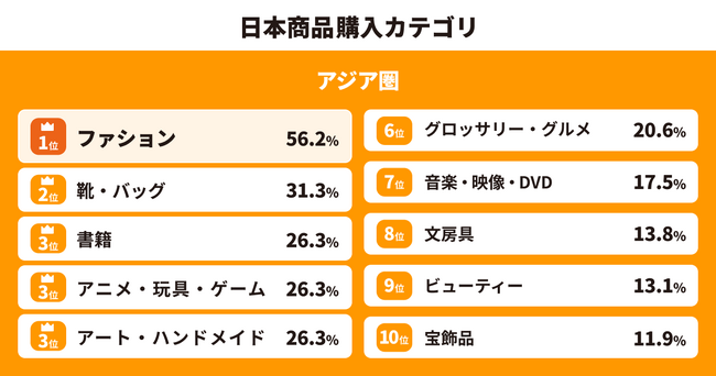 アジア圏では、「ファッション」が最も高く56.2%、続いて「靴・バック」で31.3%となりました。英語圏の購入カテゴリと比較するとアパレルカテゴリの人気が高くいことがわかります。また、英語圏ではランクインしなかった「グロッサリー・グルメ」が2割程度と、越境ECを利用して食品も購入されていることがわかります。