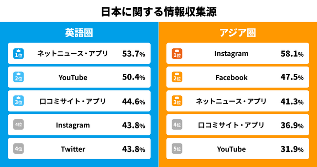 「WorldShopping」利用ユーザーの英語圏、アジア圏に国籍を置く10~60代男女281名を対象に調査を実施しました。まず、「日本に関する情報収集源」を聞きました。英語圏では「ネットニュース・アプリ」が最も多く53.7%、アジア圏では「Instgram」で58.1%となりました。英語圏では「YouTube」の利用も50.4%とアジア圏に比べて高い傾向にあり、動画でも積極的に日本の情報を収集している様子が伺えます。アジア圏では「SNS」の中でも「Instagram」「Facebook」が上位となり、友人・知人の投稿やコミュニティからの情報を参考にしているようです。