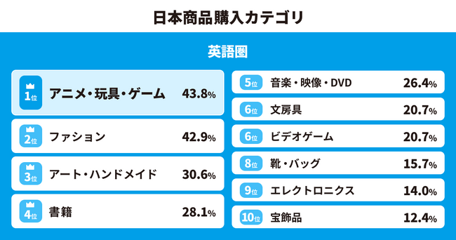 日本商品を購入した経験がある人を対象に「購入した商品のカテゴリー」を聞きました。英語圏では「アニメ・玩具・ゲーム」が最も多く43.8%、「ファッション」が42.9%、「アート・ハンドメイド」が30.6%となりました。