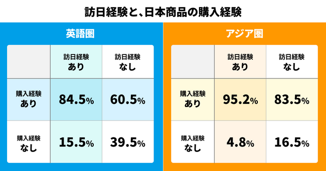 英語圏では「訪日経験あり」と回答した人の84.5%が「(日本のECサイトで商品の)購入経験あり」と回答し、訪日したことがない人に比べて24ポイント高い結果となりました。アジア圏でも訪日経験者の購入割合が高く、「日本商品の購入経験割合」も英語圏に比べて高い様子が伺えます。