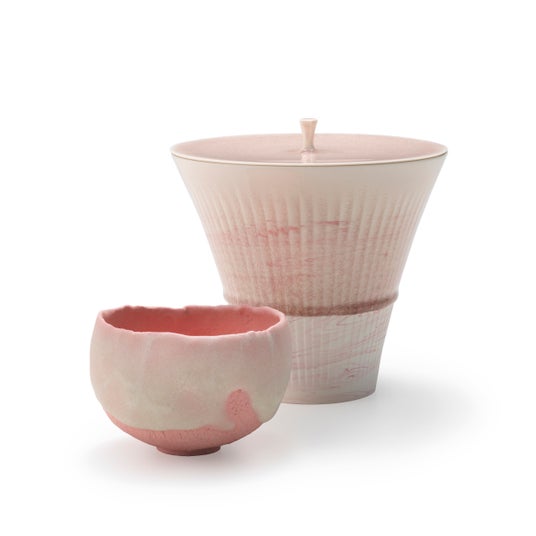 星野友幸(陶芸)(左)茶盌「糖衣」w11.8×d11.2×h8.1cm、(右)練継水指「ピンクグラス」 φ18.5×h18.5cm