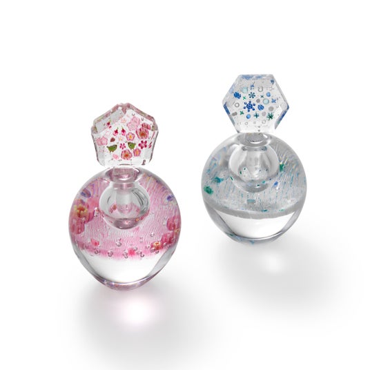 三留 舞(ガラス)香水瓶(左)「春爛漫」φ6.4×h10.3cm、(右)「六花」φ6.3×h10cm