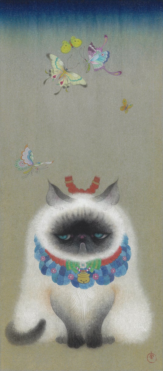 田島周吾(絵画)「六蝶猫鎮座図」 w18×d41cm