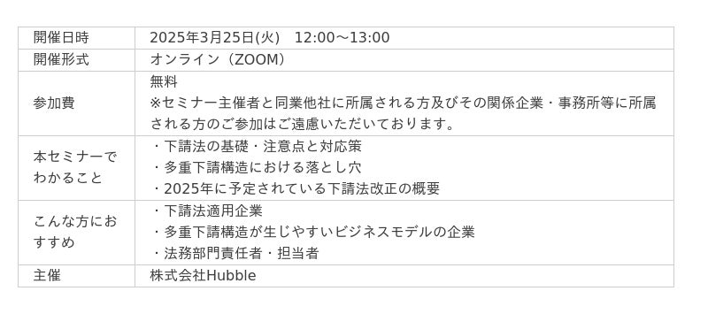 法務と事業部門の協業性を高める契約業務・管理クラウドサービス「Hubble(ハブル)」を提供する株式会社Hubble(東京都渋谷区、CEO:早川晋平)は、2025年3月25日(火) 12:00-13:00にて、独占禁止法・下請法の実務の専門家として活躍する三浦法律事務所 パートナー/弁護士 渥美 雅之先生を講師にお迎えし、「下請法・独占禁止法の落とし穴と対応策~多重下請構造にも要注意~」と題したウェビナーを開催いたします。本ウェビナーはZoomでのオンライン配信・事前登録制です。