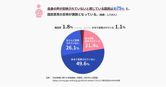 日本は自らの意見が社会に反映されていないと感じる国民が7割以上と高い水準になっています。この課題を解決するためには、誰でも気軽に行政との仕組みづくりに参加できるツールが必要です。サービス提供を通じて、住民と行政が共に政策を創る「政策共創」ができる社会を目指しています。