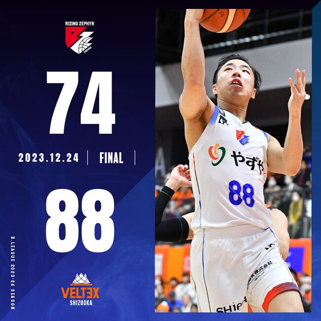 2023年12月24日(日)に開催されました【ベルテックス静岡vs.ライジングゼファーフクオカ】において“静岡88-74福岡”の結果となりましたことお知らせいたします。