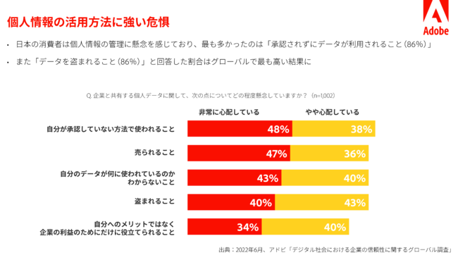 日本の消費者は個人情報の活用に特に高い懸念を示しており、75%が「自身のデータを企業がどう利用するのか」を懸念しています。また83%が「自身のデータが企業に盗まれる」ことを危惧しており、これはグローバルのどの地域よりも高い数値となっています。個人情報の管理に自信を持っている経営層が多い一方で、顧客は企業へのデータ提供に躊躇している様子が明らかとなりました。
