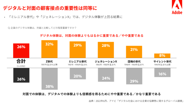 今回の調査では、日本の消費者がデジタルにおける顧客接点を対面と同様に重要と捉えていることが判明しました。世代別の回答を見てみると、ミレニアル世代やジェネレーションXでは、対面よりデジタル体験を重要視する傾向が明らかとなっており、約2年にわたるパンデミックを通じて、顧客体験が大きくデジタル化した様子がうかがえる結果となりました。