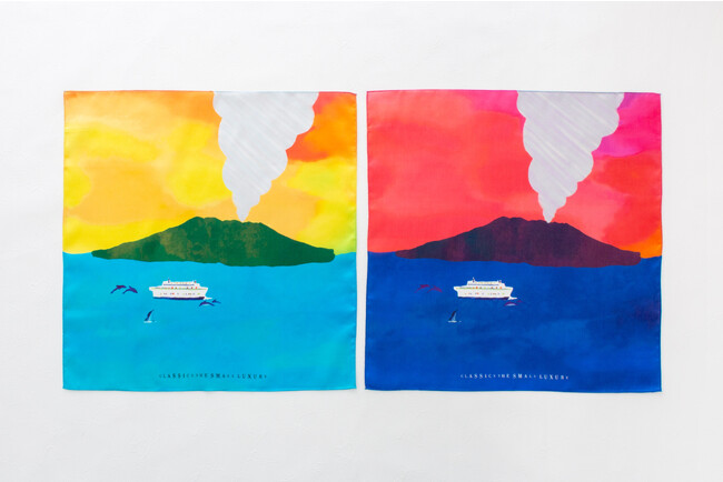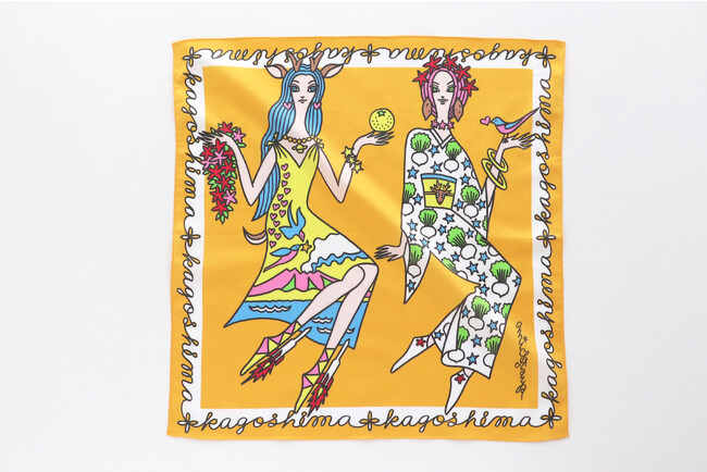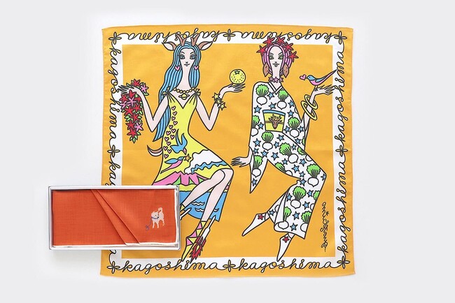 ビジュアルアーティスト、ミック・イタヤさんによる描きおろしのハンカチーフ。桜島をはじめ、さつまいも、ポンカンなど、鹿児島にまつわるアイコンがギュッと詰まった一枚です。