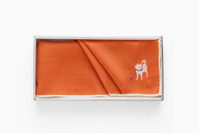 犬好きの西郷さんの愛犬ツンを粒縫い刺繍で表現しました。ハンカチーフの素材はしなやかな肌ざわりが特徴の海島綿で、吸湿性と耐久性に大変優れています。