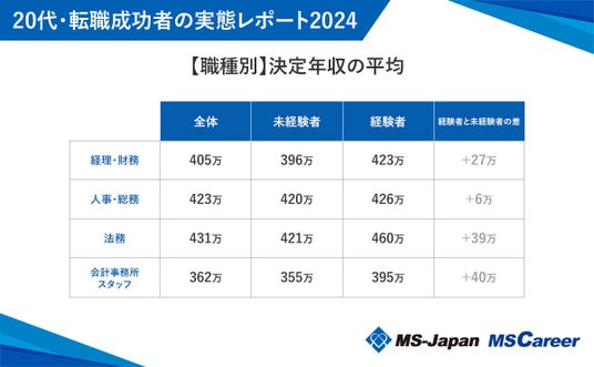 また、未経験者と経験者の年収の差が最も大きいのは「会計事務所スタッフ」で、その差は40万円という結果となりました。