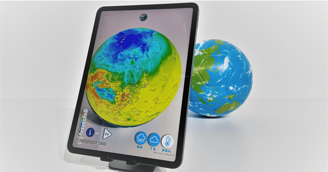 従来のアースボールのモデルと同様に、タブレットやスマートフォンで専用アプリ(無料)をかざすと、世界の今の雲・雨・気温の様子や、世界の動物、世界遺産など、20種類以上のARコンテンツが楽しめます。