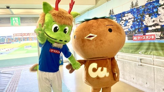 日立市民運動公園 陸上競技場に、水戸ホーリーホックマスコットキャラクターの「ホーリーくん」とJX金属PR大使の「カッパーくん」が来場!