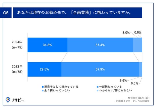 Q2で「レベル1・レベル2・レベル3」と回答した方に、「Q5.あなたは現在のお勤め先で、「企画業務」に携わっていますか。」と質問したところ、2024年は「担当者として携わっている」が34.8%、「一部携わっている」が57.3%という回答となりました。